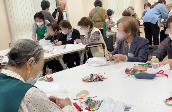 体調の話や昔話、この間行った旅行や話題のニュースの話をしながら手を動かし、あっという間に出来上がっていきます。カラフルで可愛らしいリースに目を細めたり、おしゃべりに笑ったり、みなさん本当に楽しそうでした。