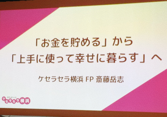第2部では、FPオフィスケセラセラ横浜代表の齋藤岳志先生をお迎えし「お金を貯める から 上手に使って幸せに暮らすへ」という、お金との向き合い方についてお話を伺いました。