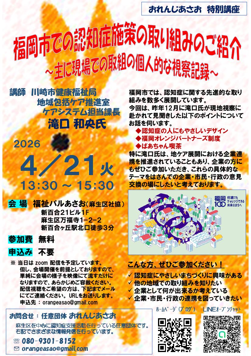 おれんじあさお特別講座「福岡市での認知症施策の取り組みのご紹介」